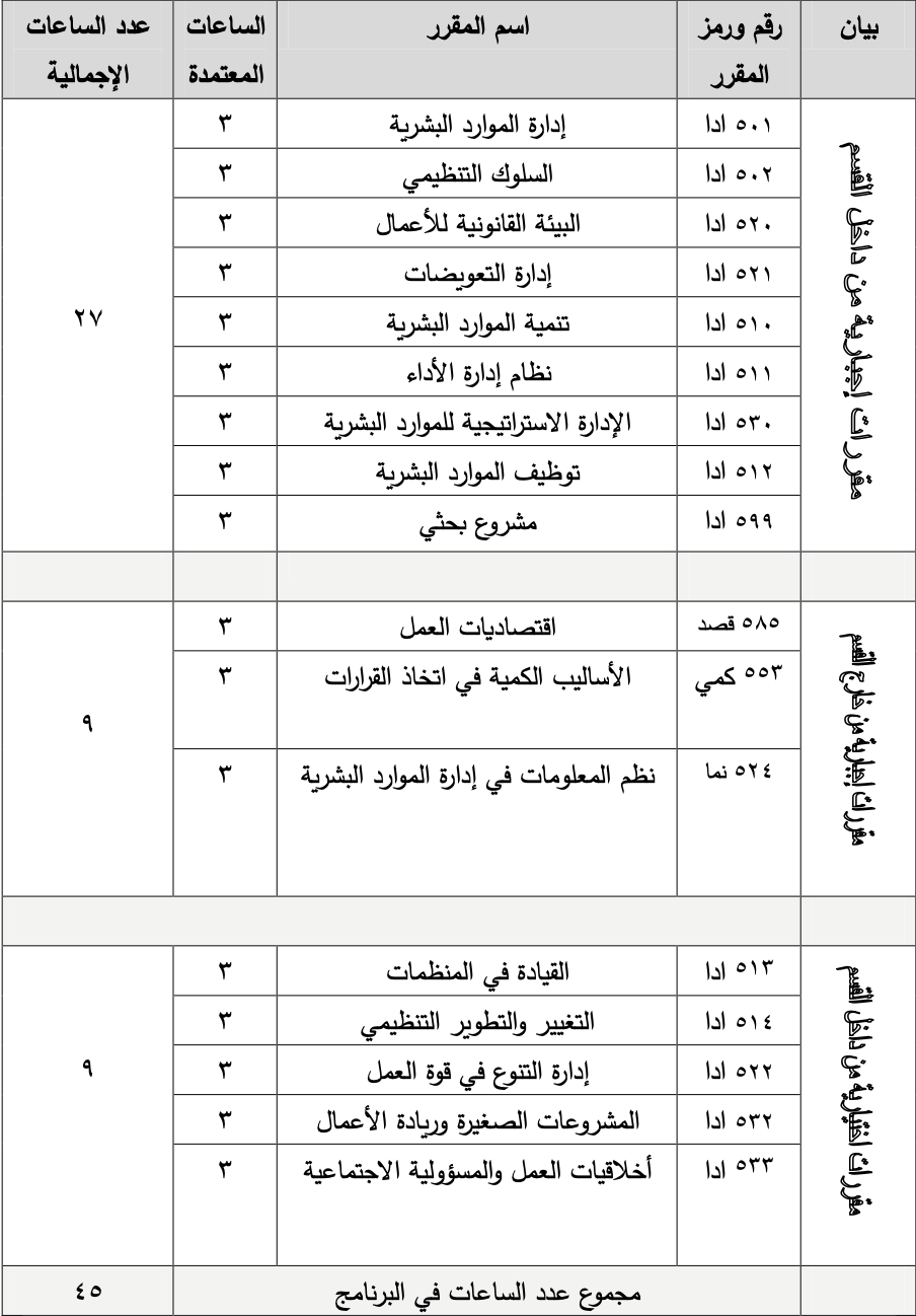 ١. تزويد الطلاب ومديري الموارد البشرية بالمعارف والمهارات اللازمة في مجال إدارة الموارد البشرية من خلال التركيز على الأسس النظرية والتطبيقية في الوقت ذاته.
